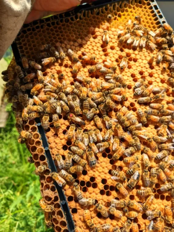 Les essaims sont vendus avec une reine sélectionnée sur 5 cadres avec du couvain d’abeille issu de celle-ci ainsi que de la ressource miel et pollen.